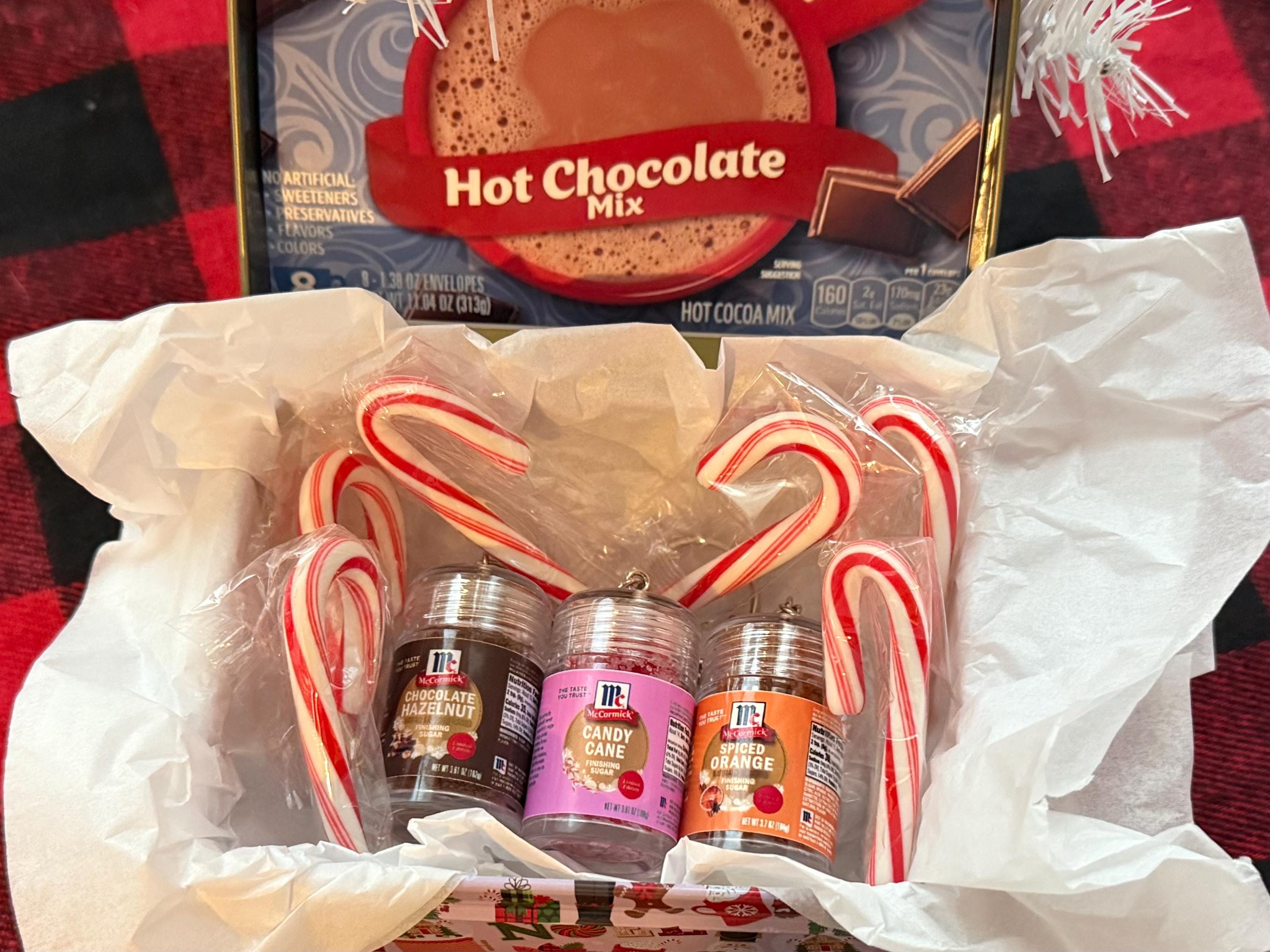 The 3 Set comes with 3 different Sugar Seasonings 2 Packet of Swiss Hot Chocolate and 3 Mini Candy Canes,